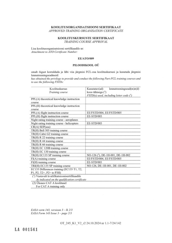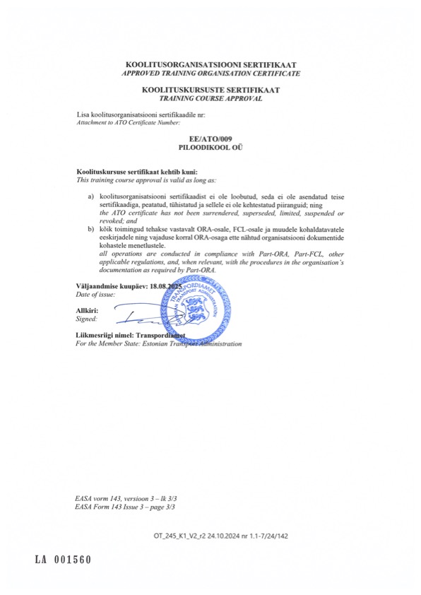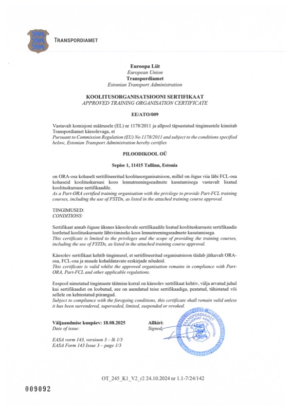 Piloodikool is a approved training organisation EE/ATO/009 certified by the Estonian Transport Administration.